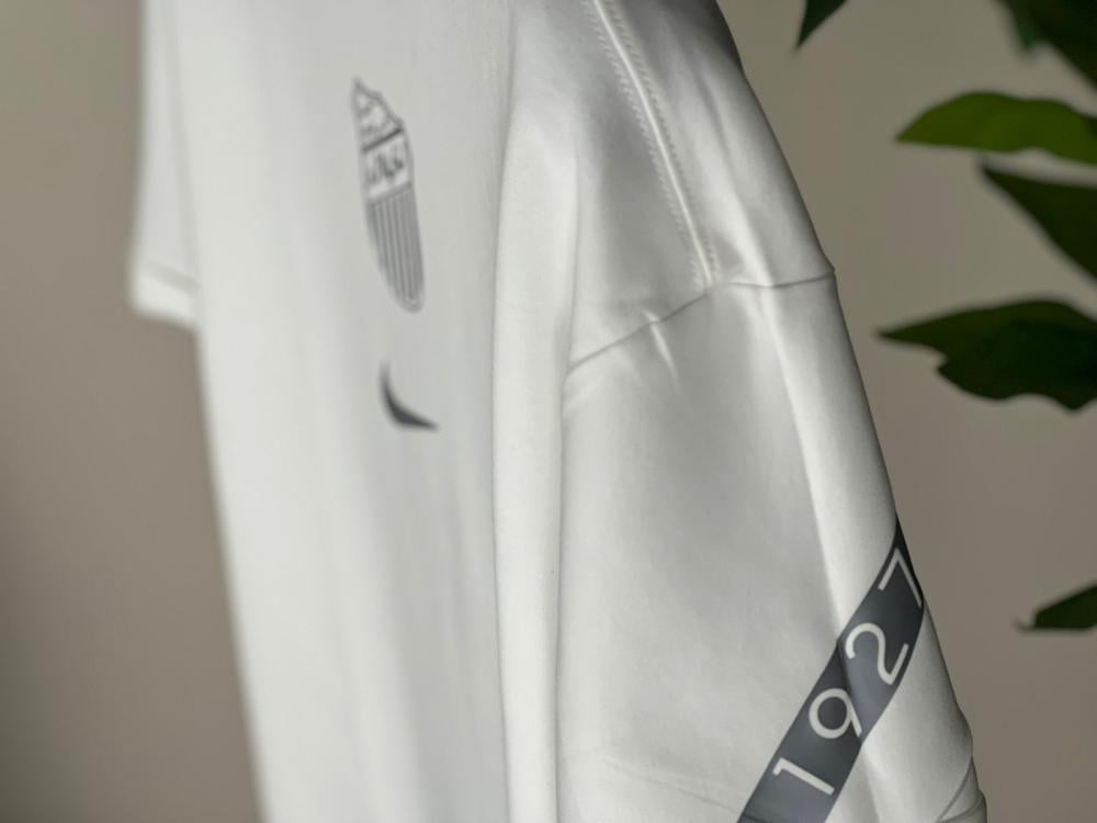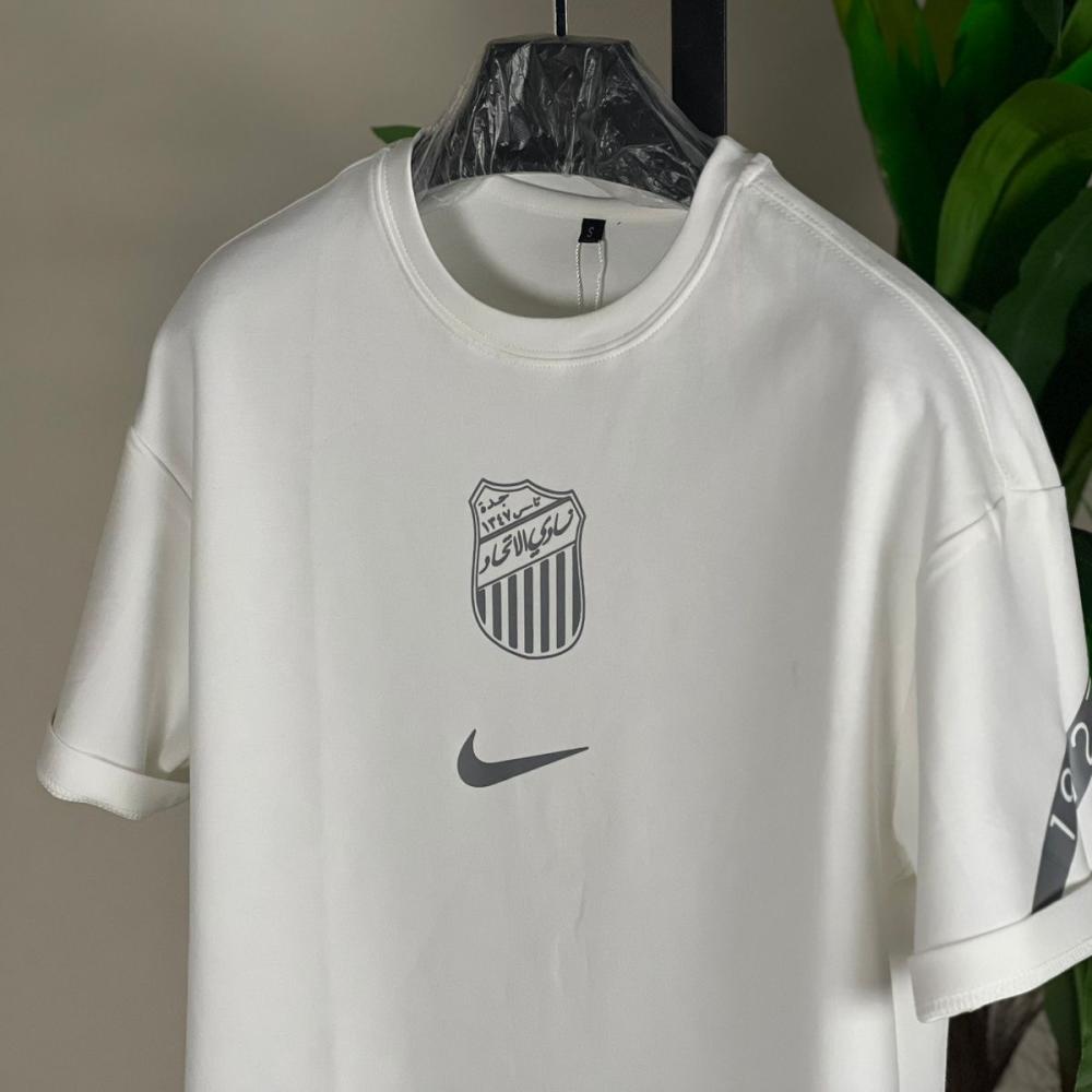 تيشيرت نادي الاتحاد الأبيض تصميم بسيط وأنيق يحمل شعار النادي بتطريز عالي الجودة وشعار نايك باللون الرمادي لإطلالة رياضية فخمة.